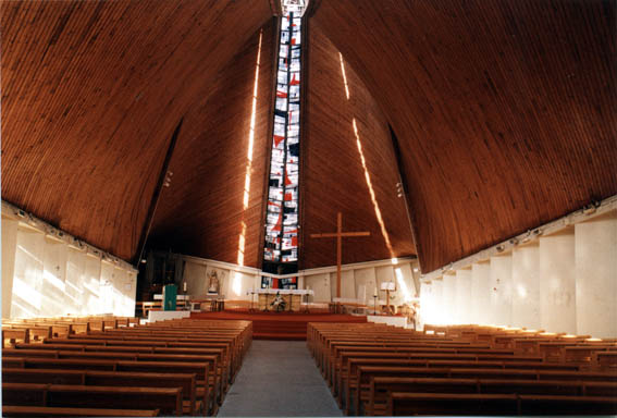 La nef est constituée d'un seul vaisseau sans pilier, reposant sur des voiles minces en béton décalés les uns par rapport aux autres, qui permettent ainsi de loger entre eux des verrières tournées vers l'autel.