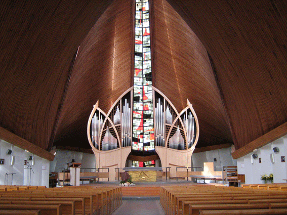 Je ne peux pas parler de l’orgue de Saint-Thibaut sans faire un petit (tout petit) tour dans cette église “moderne”. Le plan de l'édifice, construit grâce à la volonté et à l'engagement des habitants du plateau alpico-marlychois, ne reprend pas le plan classique de la croix. Pourtant ce symbole fort y est présent : ce sont les verrières de la flèche, haute de 35 m, qui forment une croix de lumière, dont la croisée est au centre de l'autel. Aussi, celui-ci est placé juste à l'aplomb de la croix qui, à l'extérieur, termine cette flèche, et il est paré en son centre d'une croix de bronze, œuvre de l'artiste Muriel Rosset.
